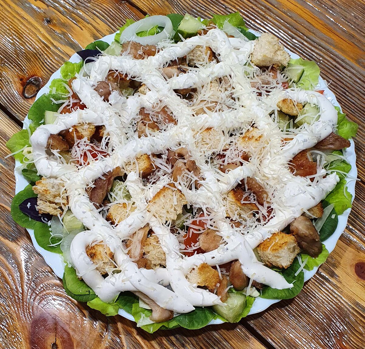 Этот салат имеет огромное количество рецептов, его можно делать с курицей, с креветкой, с морепродуктами, да и вообще фантазия ничем не ограничена. Однако у всех рецептов данного салата есть общие ингредиенты: сухарики, зеленый салат, лук, огурец и сыр пармезан. Но вообще состав может варьироваться, в зависимости от повара. В этот раз я решил сфотографировать "сочные" фотографии его приготовления. Готовиться салат очень быстро и когда внезапно пришли гости, можно сделать вкусную закуску за несколько минут.