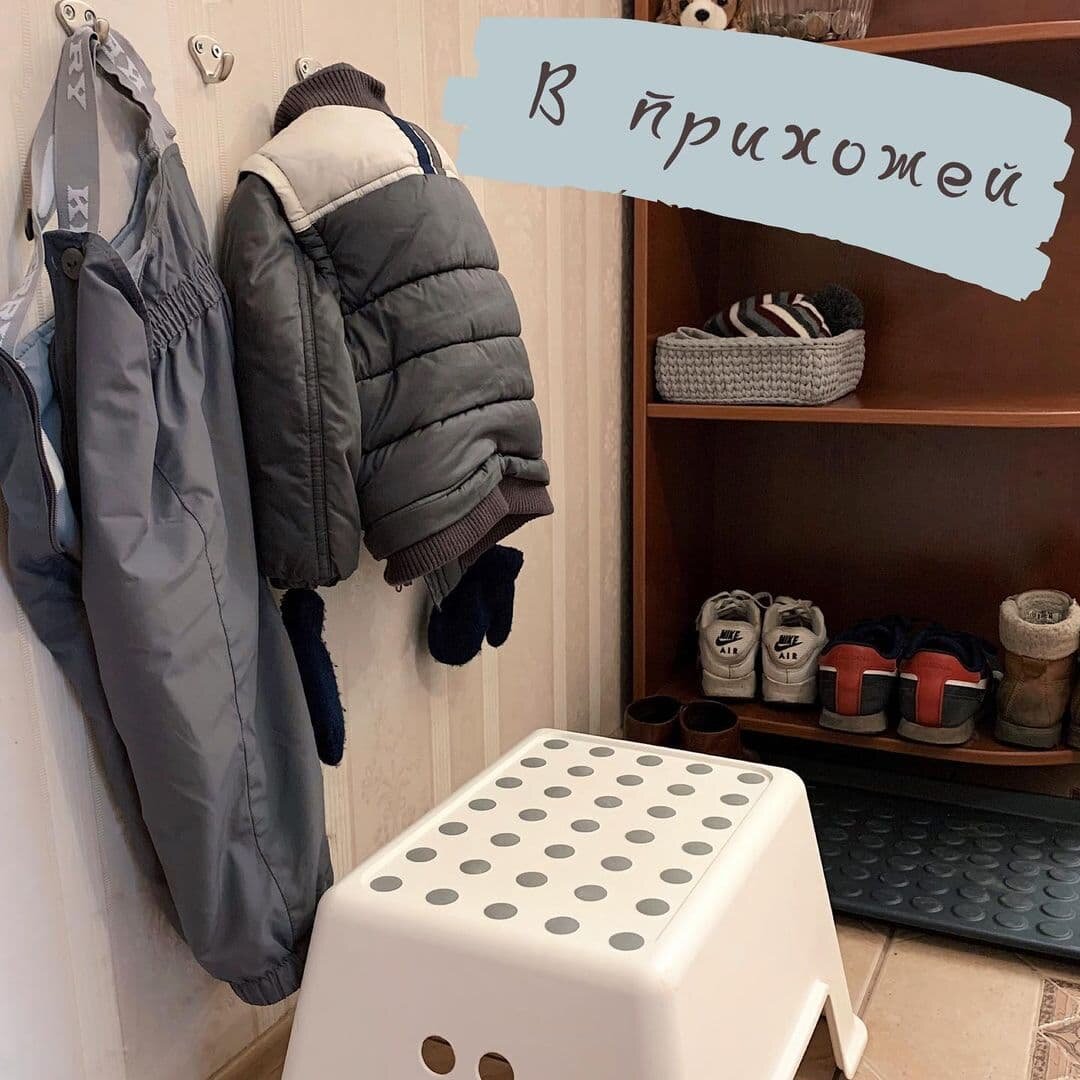 В этой зоне нужно разместить крючочки на уровне глаз ребёнка. Поставить небольшую скамеечку или стульчик, чтобы малыш мог сам обуваться. В небольшую корзину или коробку положить шапку, варежки, шарф.