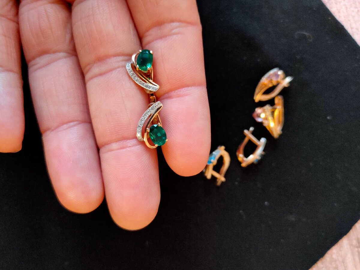 Золотые серьги с искусственными изумрудами и натуральными бриллиантами. Такие серьги я подарил супруге на ее прошлый день рождения.