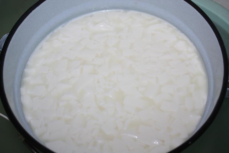 Следующий шаг характерен именно для американских сыров в стиле Джек - промывание сырного зерна холодной водой. Непрерывно помешивая, постепенно добавляйте холодную воду, чтобы температура стала 30 градусов. При этой температуре перемешивайте еще 15 минут.