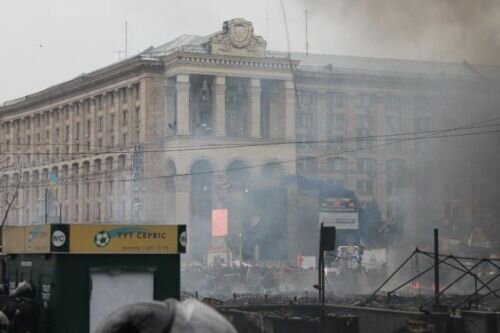Небольшой офис на первом этаже жилого дома вначале разгромили, а потом сожгли в пламени горящих шин. На дом, где он расположен, страшно смотреть: он закопчён многодневным дымом пылающей резины. Гигантский, метров десять высотой, рекламный щит стал просто чёрным, с огромным трудом под слоем сажи просматривается, что на нём было изображено. Жители дома сбежали из него после 19 января, лишь на паре балконов висят растяжки: «Здесь живут люди».