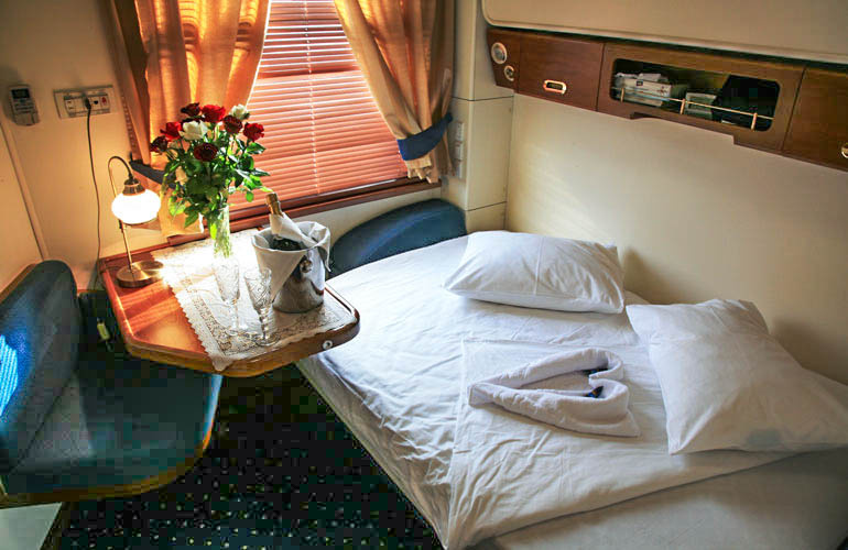 Прежде всего, впечатление как от роскошного круиза! В составе поезда Золотой Орел: вагоны–рестораны, банкетные залы; вагон салон-бар с танцевальной зоной, пассажирские вагоны только Люкс-класса с душем, туалетом, большими кроватями.