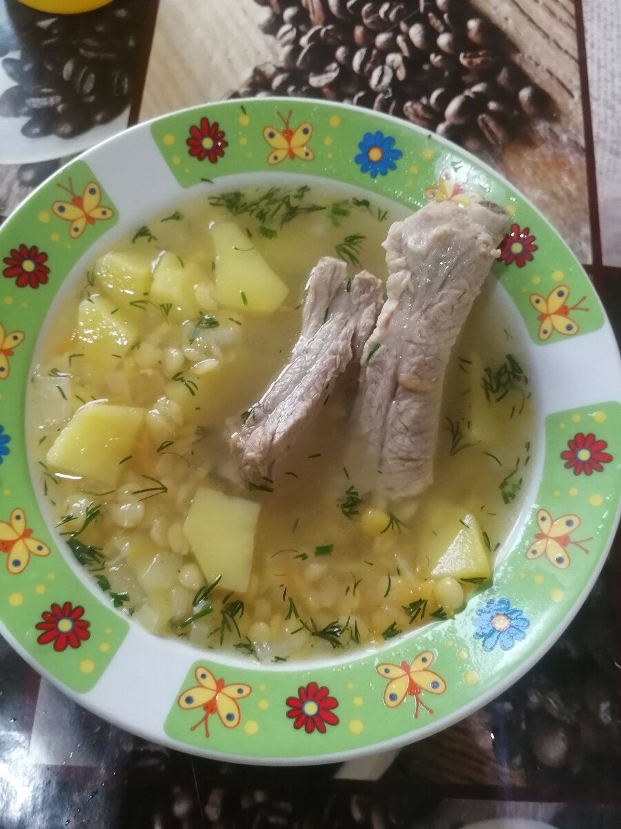 Рёбрышки варила около часа. При варке сняла всю пену. Потом кинула дробленный, заранее замоченный горох. Через некоторое время - картошку и зажарку (морковь, лук). Посолила, добавила хмели-сунели, сняла с плиты и кинула в суп зелень.