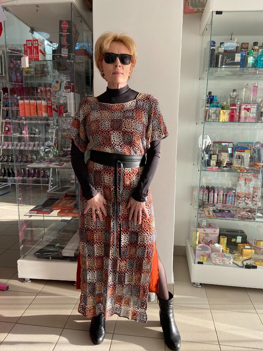 Связала платье крючком из ниточек секционного крашения. Подкладка из трикотажа (Масло).