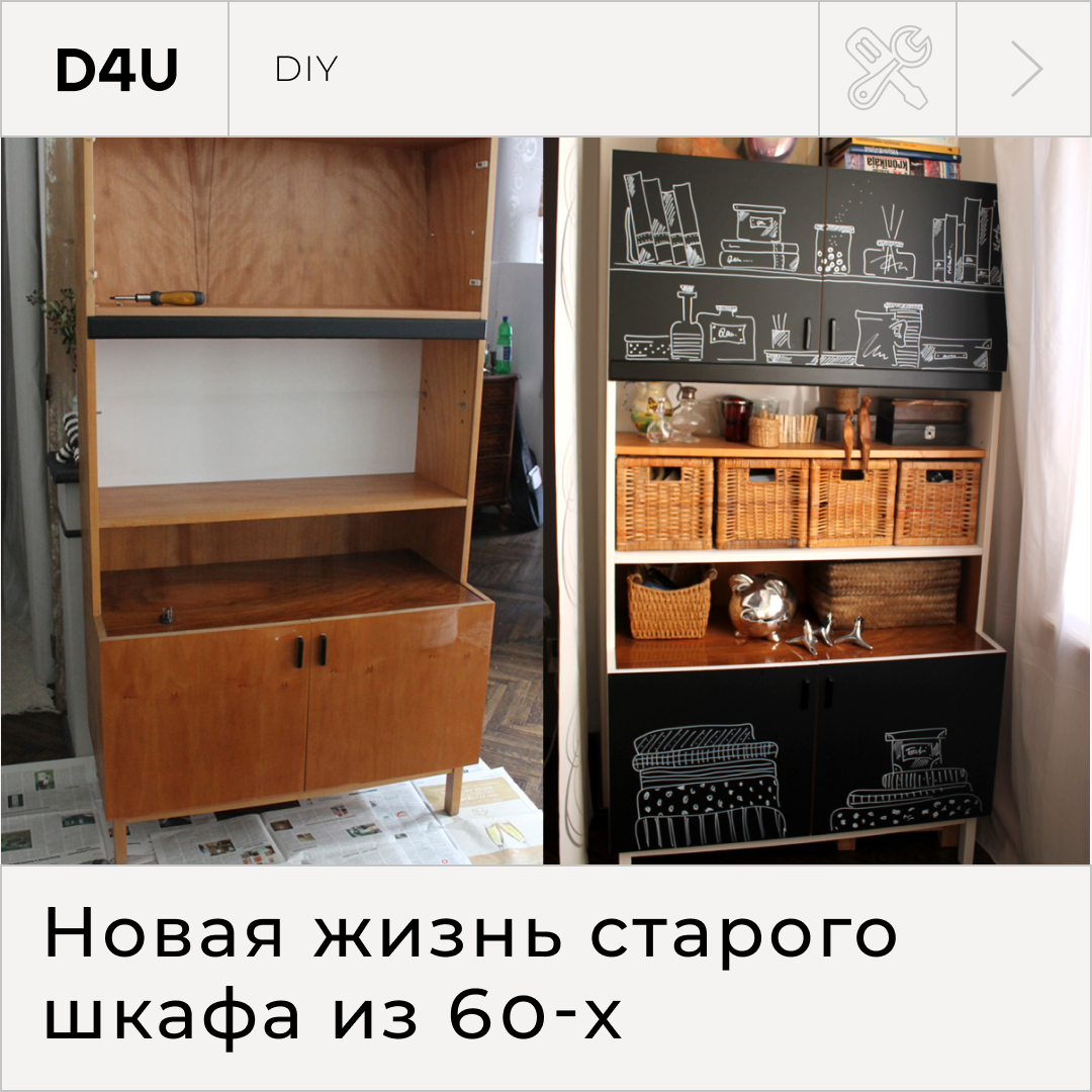 Дизайнер интерьеров Кристина Вэйн забрала из гаража старый шкаф 1960–1970-х годов — с потрескавшимся лаком, но довольно прочный. Она сняла дверцы и выкрасила их грифельной краской. Каркас зачистила от старого лака и покрасила.