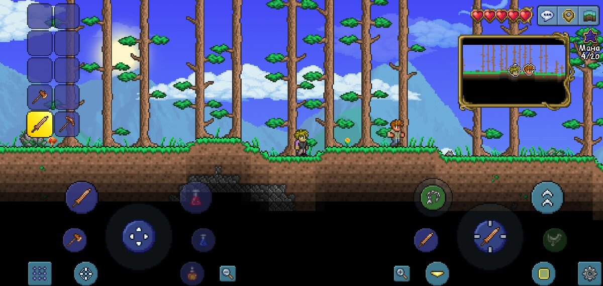 Появился я в таком вот лесочке, и тут же, почти на спавне, рядом со мной оказался Гид (в Террарии есть существа, которые типа жителей в Майнкрафт. С ними можно торговать, но некоторые имеют и спец. функции. Например Гид даёт советы по выживанию, Дриада говорит на сколько заражён мир, Медсестра лечит за монеты и т.д.и т.п).