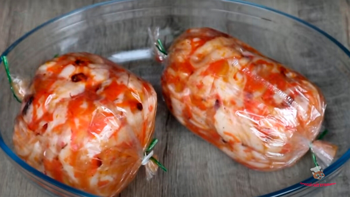 - Пакет для запекания разрезать и расстелить на стол. В него завернуть половину фарша.