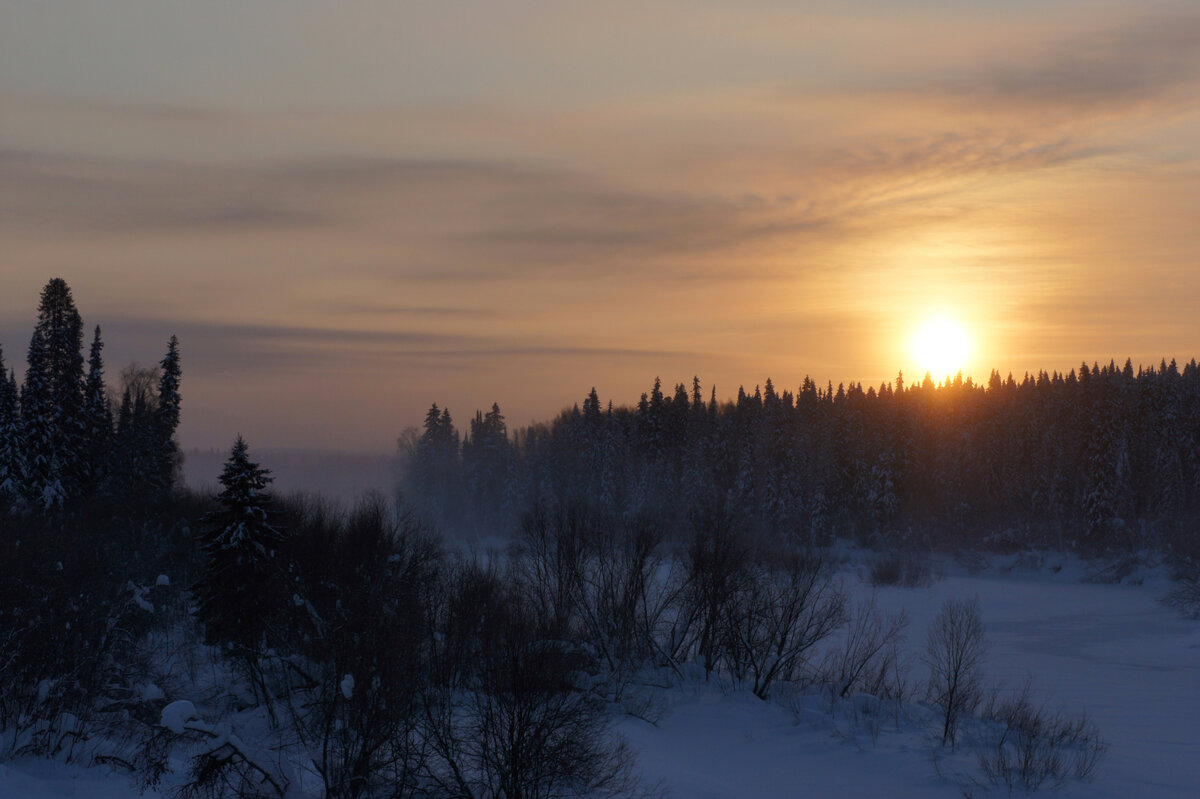 Каждый день наблюдаем, как солнце прячется за тайгу. Московский часовой пояс в Коми сделал февральские рассветы очень ранними, солнце встает еще до семи, а уходит около четырех. Световой день уже больше девяти часов, и мы благополучно забыли про генератор.