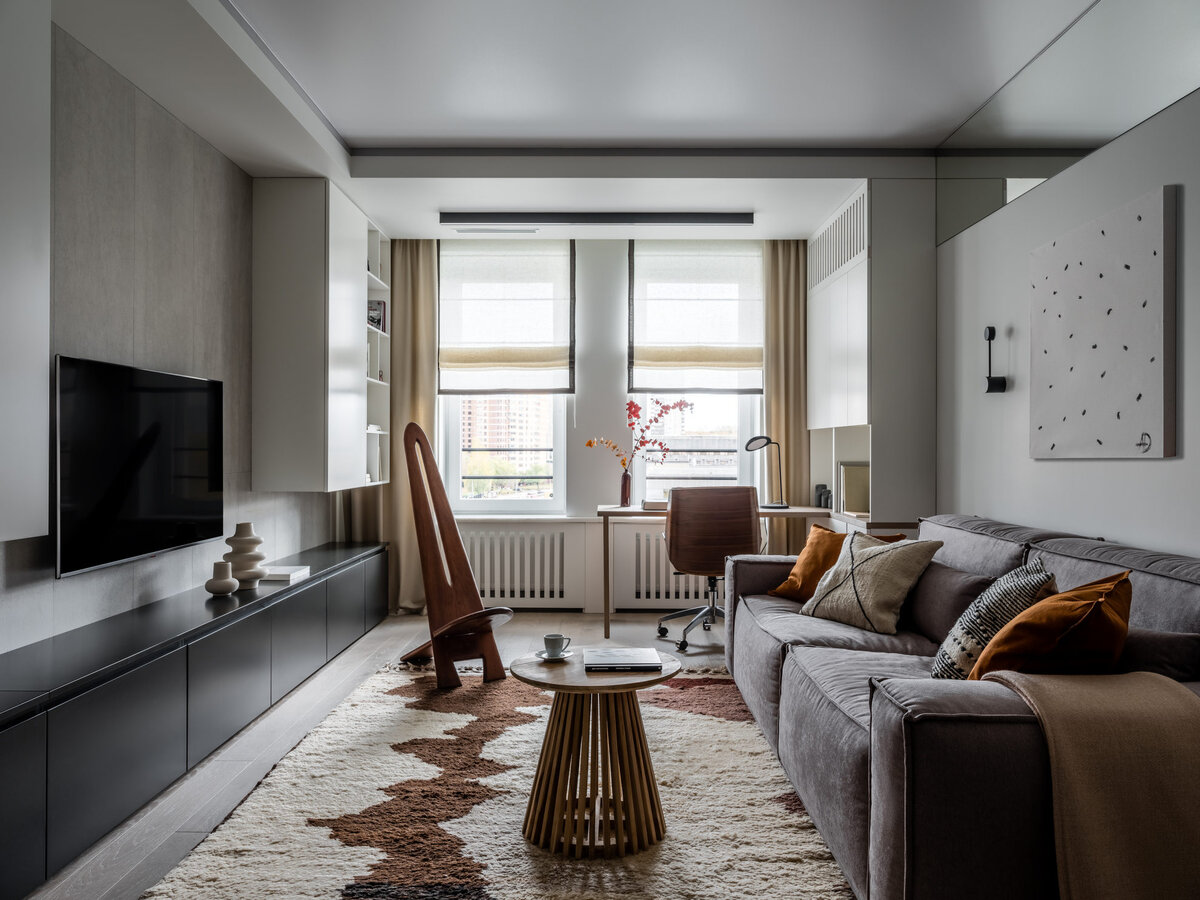 В этом проекте мы стремились создать гармонию жестких черно-бело-серых форм с теплотой дерева, мягкостью мебели, текстиля и отдельных аксессуаров, — рассказывают архитекторы. — Сюда отлично вписались винтажные стул и табурет, которые сами по себе обладают какой-то невероятной теплотой, так же как чудесный берберский ковер.