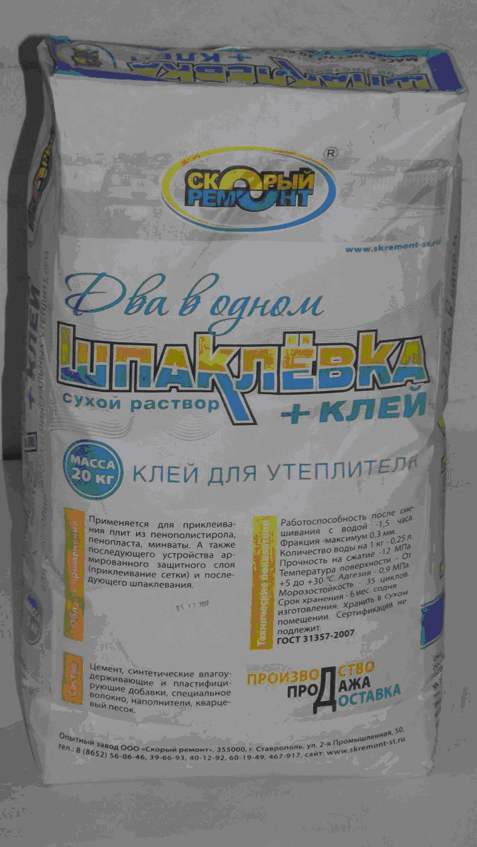 Смесь на основе песка, цемента и полимерных модификаторов, для приклеивания пенополистирола и минеральной ваты. Применяется для приклеивания сетки и последующего шпаклевания.
