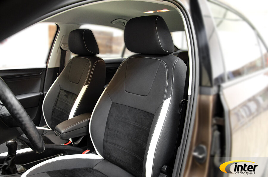 Чехлы Сшиты из искусственной кожи Фиат черного цвета и отстрочены белой нитью. Боковая поддержка выполнена с белыми вставками.