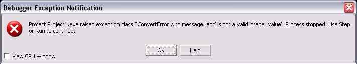 Теперь программа запустится. Попробуем ввести число и нажать кнопку - никакой ответной реакции не наблюдается. Это верно, ведь мы кроме считывания введённого числа ничего не запрограммировали. А теперь попробуем ввести посторонние символы (т.е. не цифры) - программа "вылетит" с сообщением об ошибке: