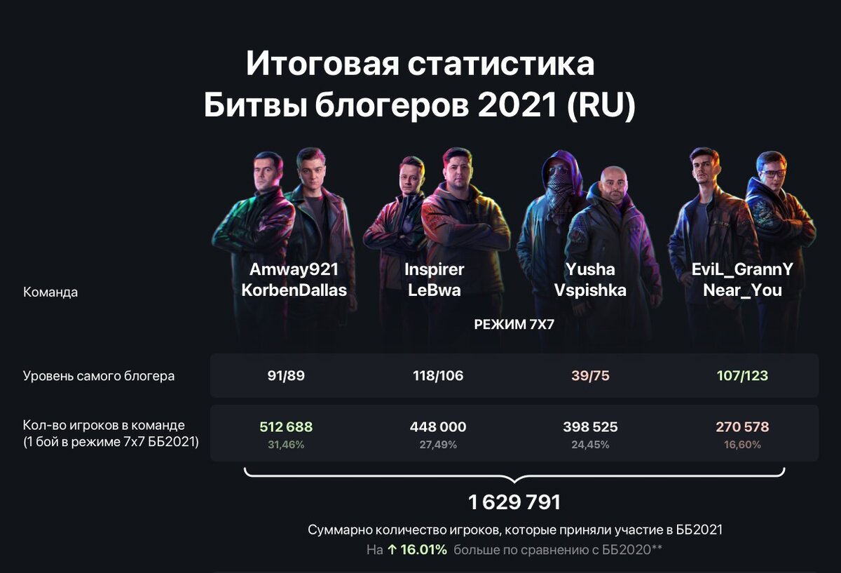 Спустя долгое время, появилась возможность взглянуть на статистику "Битвы блогеров" 2021 года. А именно можно узнать сколько человек играло за ту или иную команду и посмотреть примерный портрет игроков, который сыграли минимум 1 бой в режиме 7 на 7.