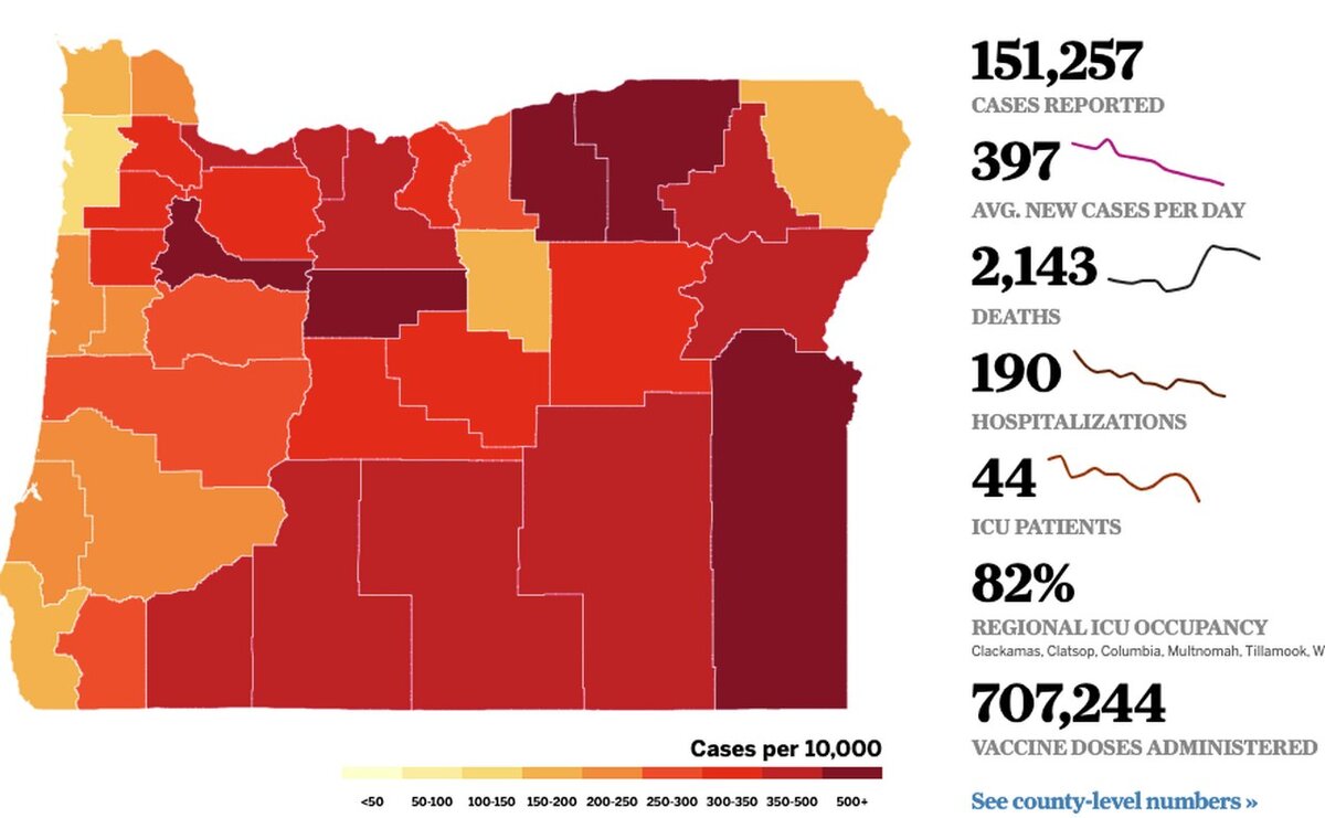 По большинству показателей, штат Орегон преодолел зимний всплеск заболеваемости и сообщает о самых низких показателях с октября.