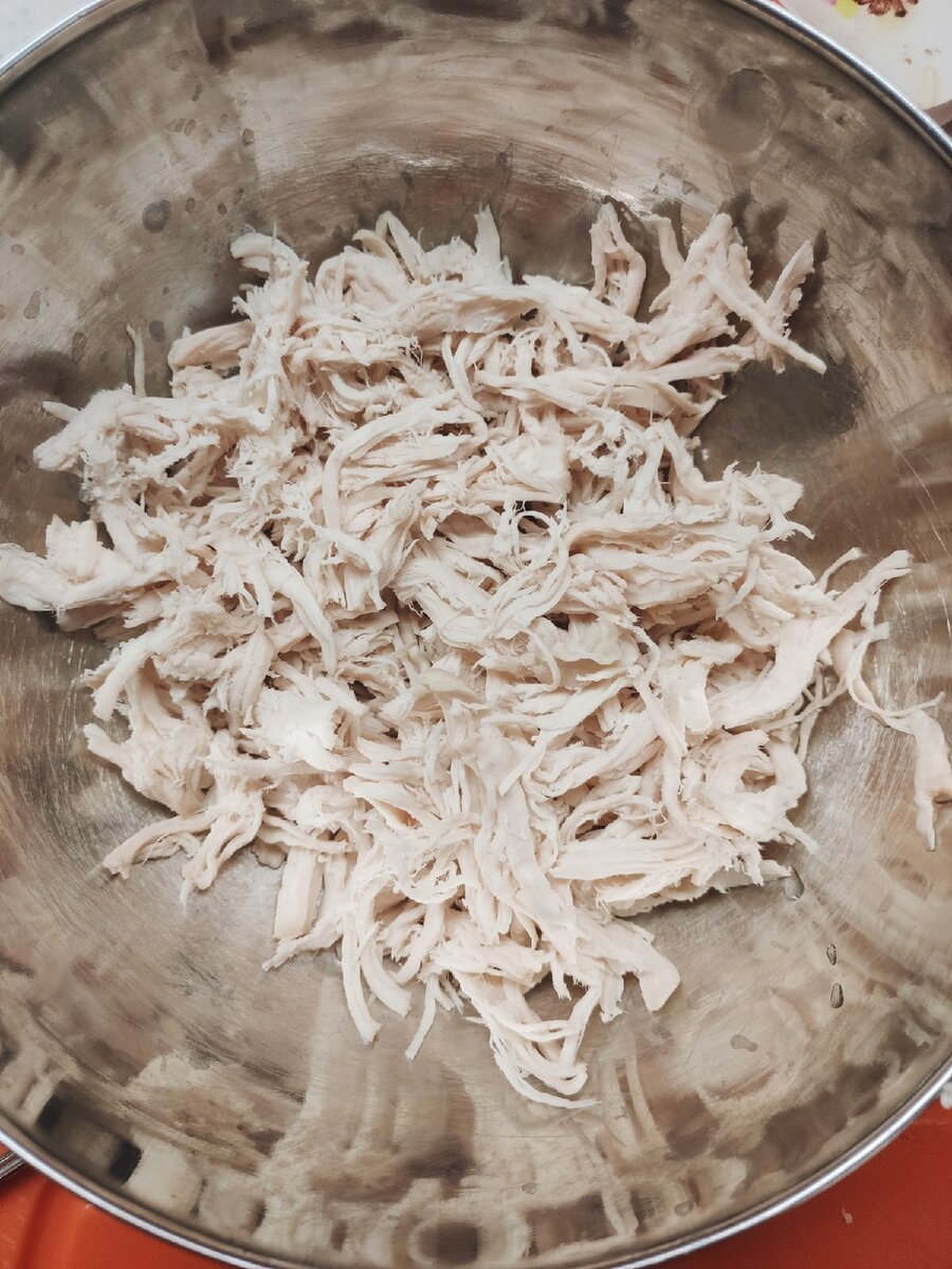 1. Отвариваем куриную грудку в подсоленной воде, разделяем на волокна