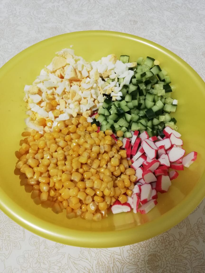 Нарезаем крабовые палочки небольшими кусочками. Мелким кубиком нарезаем огурец и яйца (предварительно отварить). Высыпаем всё в ёмкость и добавляем кукурузу.