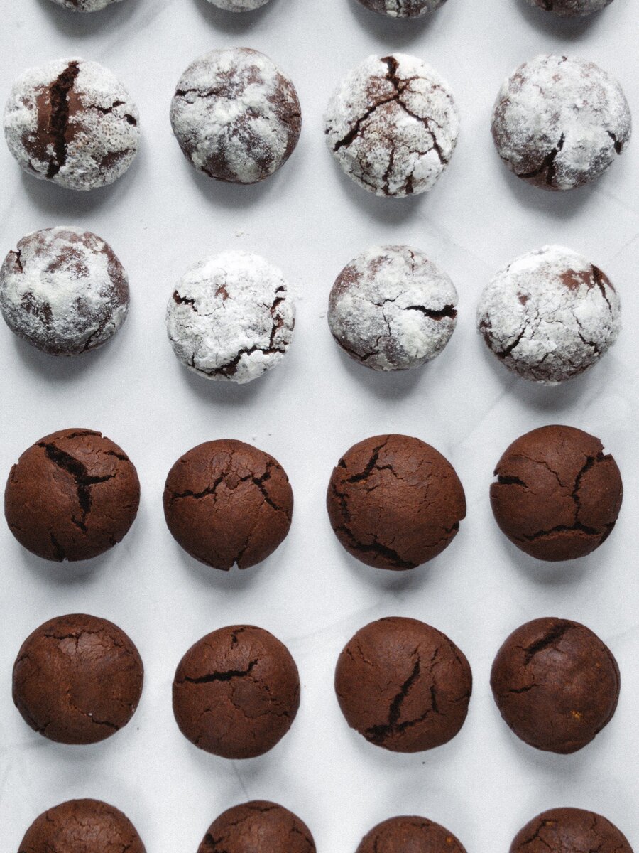 6. Разогреваем духовку до 180°С, противень застилаем пергаментом. Из охлажденного теста скатываем шарики по 20-25 грамм (я половину сделала в сахарной пудре), выкладываем на противень, оставляя расстояние 3-4 см.