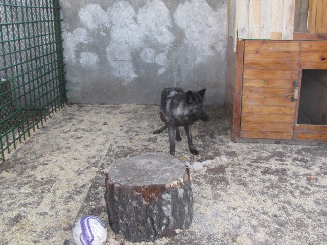 Там их ждал сюрприз, в виде соплеменницы, чёрной волчицы Багиры( о ней я расскажу позже). Баги была их ровесницей, ей, как и им было 11 месяцев, пока они ещё не достигли возраста половой зрелости, их можно было держать в одном вольере, что упрощало ситуацию с нехваткой места. Сначала Лорд и Грей не обратили внимания на соседку, у них был очередной стресс по смене места жительства и ещё какое-то время они скрывались в своей будке, уже в новом вольере. Увидеть серых братьев можно было только с началом сумерек, когда их уже ждал ужин, а днём они сидели в будке, иногда осторожно кто-нибудь из них выходил на разведку, осматривал территорию приюта и снова скрывался внутри.