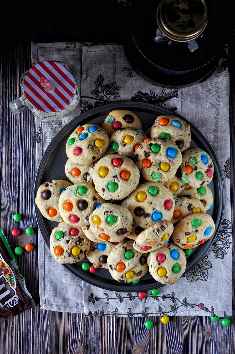 Выпекать печенье на пекарской бумаге или силиконовой коврике, 9 шт на противень, сформировать в виде шайбочек, украсить Эмендемс.
