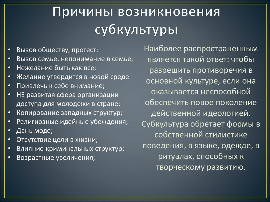 Фактически каждая из них является своеобразным протестом против привычного, сложившегося и порядком надоевшего. Это, конечно, не высокие цели наших предков, но и не проблемы «быдла» - каждая субкультура обладает собственными ценностями – как материальными, так и духовными, но является совершенно непохожей на существующий социум. Каждая субкультура в любом случае будет иметь в себе элементы нормального общества, иногда они фактически и не отличаются от «нормы», непонятно, когда и кем установленной, но можно не сомневаться – день Х, когда субкультура проявит себя, обязательно настанет. И он настал – в ХХ в. От субкультуры – любой, просто так избавиться нельзя, даже кардинальными мерами (конечно, если под ними Вы не имеете в виду убийство всех ее последователей вплоть до 7 колена) – помещение последователей в места не столь отдаленные только укрепляет их в своих идеалах, делая в глазах других мучениками. В заключении человек озлобляется – и в конце концов получает свободу, где продолжает проповедовать свои устремления. Да и сама тюрьма – это причина появления новых субкультур, жестоких и несправедливых. Лучше всего, чтобы не порождать новых субкультур, не обращать на них ни гонений, ни обожествлений – нейтральное отношение станет Вашей победой. Нужно просто понять для себя, что эти течения – неизбежны, и никуда они от нас не денутся (или мы от них), наша задача – дать им возможность действовать если не в гармонии, то, не мешая друг другу.