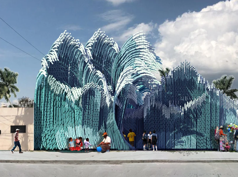 В рамках концептуального проекта под названием "Новая волна" (UMA) предлагает использовать переработанные пластиковые бутылки из океана для строительства художественной школы в Мексике, используя выброшенные объекты для создания фасада здания, проектная группа намерена подать