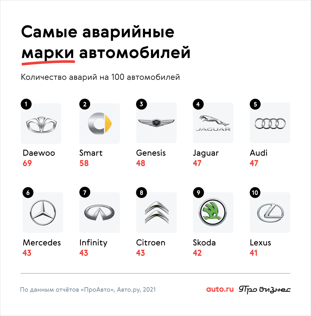 Тем покупателям, которые выбирают автомобили марок Daewoo, Smart и Genesis, стоит быть внимательнее — машины этих брендов чаще всего имеют записи об авариях в истории владения. В случае с Daewoo высокая «активность» в ДТП объясняется большой любовью к этим машинам из-за низкой цены: их часто покупают для работы в такси, а также в качестве первого автомобиля, который «не жалко». Smart нередко встречаются в сервисах аренды автомобилей, а Genesis — в качестве корпоративного автомобиля.