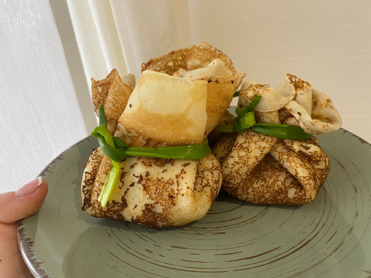 Собираем наши мешочки. В центр блинчика ложем небольшое количество мяса. Затем двумя ручками формируем мешочек. Теперь фокус. Одной рукой держим блинчик, второй вокруг обматываем стеблем лука. Не тяните сильно, когда будете делать узелок, так как лук моет порваться. Все Ваши движения должны быть плавными. Можно блинчик обматывать и двумя стеблями, так будет даже прочнее.