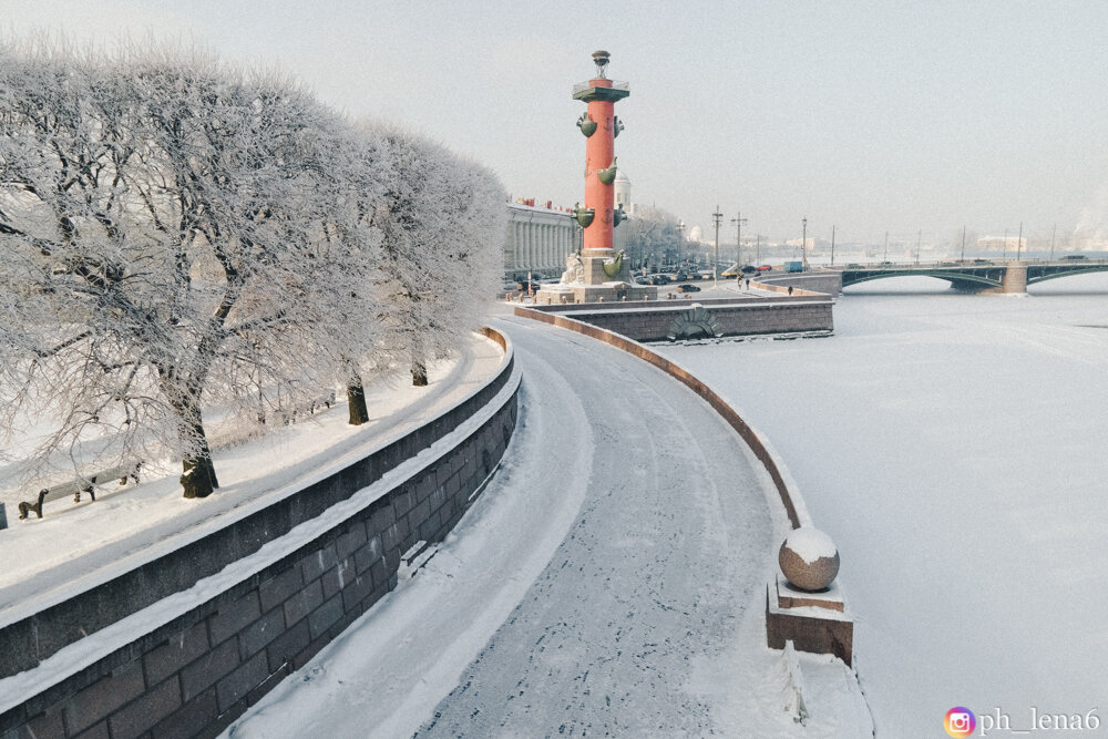 Стрелка Васильевского острова - один из самых известных архитектурных ансамблей города; Замерзшая Нева и яркая ростральная колонна 1805 года.