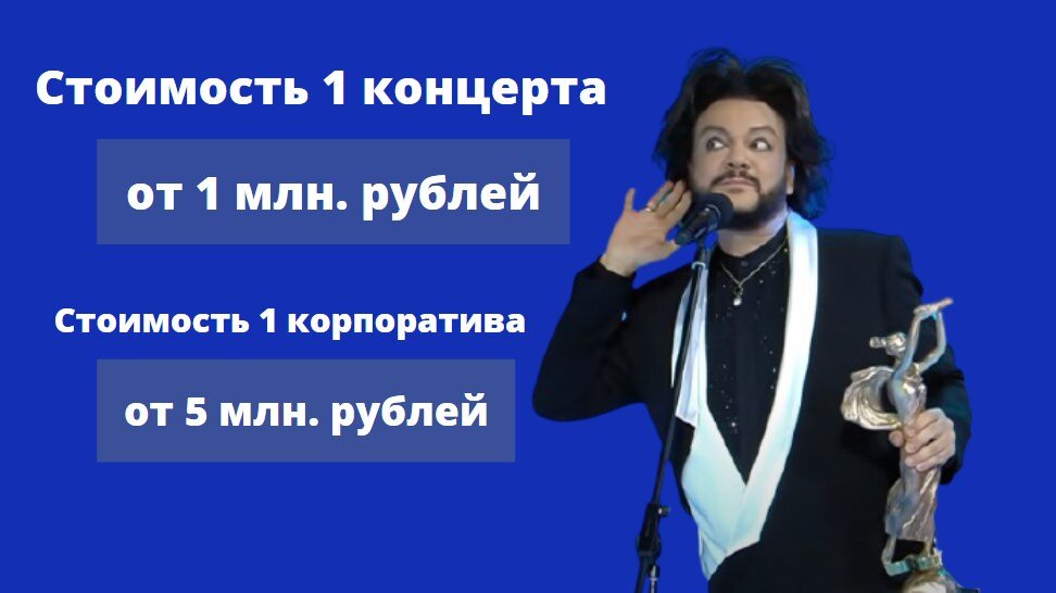 Стоимость одного концерта Филиппа - от 1,5 млн. рублей. Корпоратив, естественно, гораздо дороже.