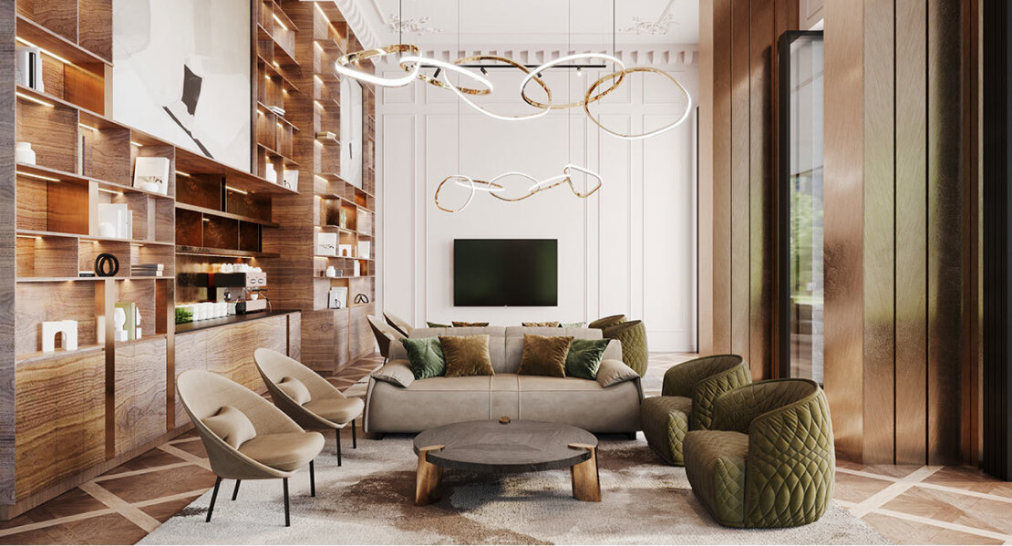 По словам Ольги Тумайкиной, коммерческого директора ГК ФСК, в проекте «Архитектор» на Юго-Западе Москвы (три корпуса, около 130 000 кв. м, более 1400 квартир), «зона коворкинга была продумана и спроектирована до ситуации с пандемией, вносить изменения в проект не пришлось». В «Архитекторе» рабочие места «только для резидентов комплекса» займут около 15–20 кв. м из 119 кв. м общей лаунж-зоны. «Это будет высокий стол вокруг настоящего оливкового дерева, – описывают в ФСК. – В столе будут сделаны выводы под розетки. Пространства хватит для 5–6 человек». Еще будет переговорная (9 кв. м), которую жильцы могут забронировать через ресепшн.