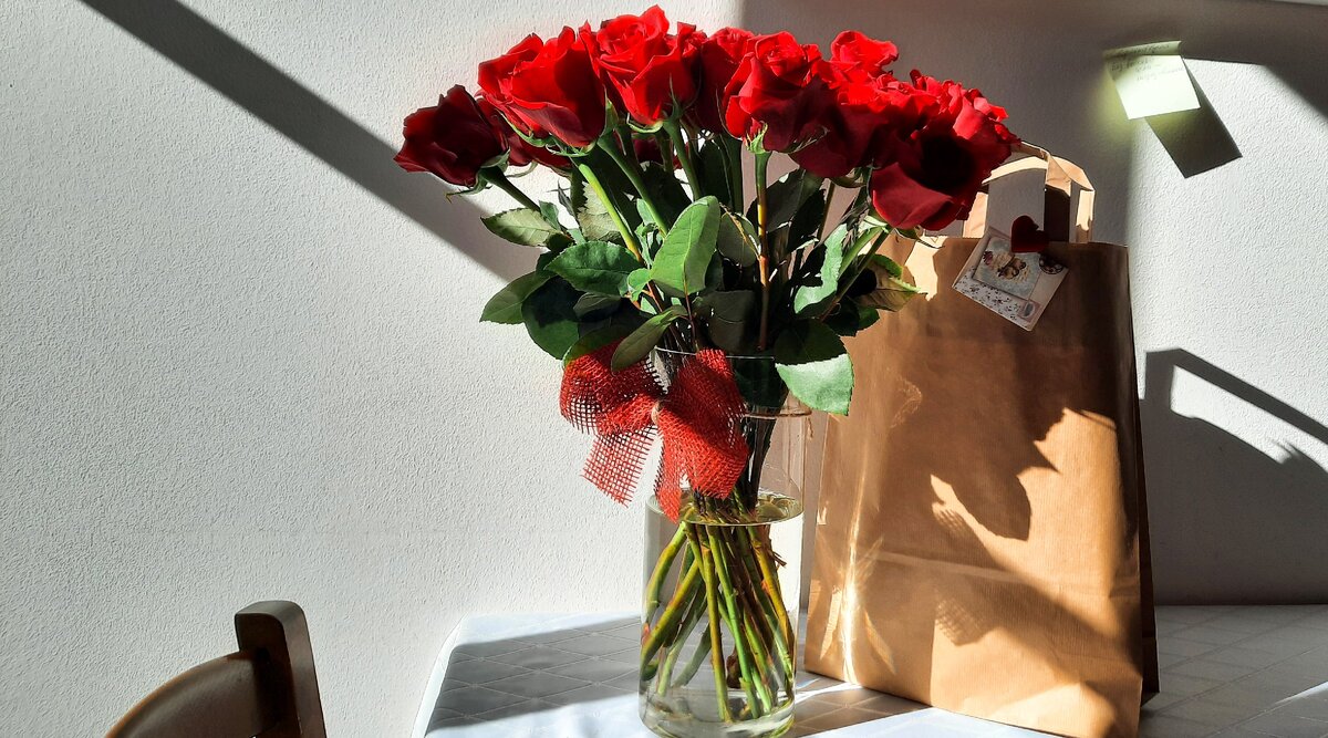В пижаме и с помятым лицом спускаюсь в подъезд, вижу букет и что-то он меня не радует. Парень отметил, что там есть письмо. Ну розы, ну красные. В голове крутилось только то, что сегодня воскресенье и раннее утро.
