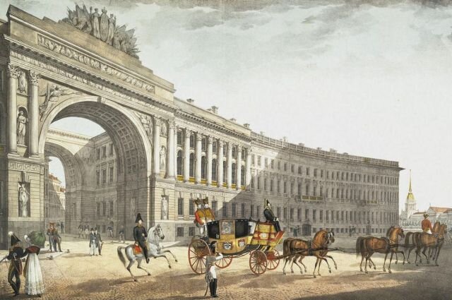 Архитектору Карлу Росси было поручено спроектировать здание для Генерального штаба и двух министерств, которые решили, что главным посланием нового архитектурного творения должно стать прославление победы русского народа в войне с Наполеоном. Никто тогда даже не догадывался, что Росси сможет построить самое длинное в то время здание в Европе, которое, казалось, пронзает сплошную ленту собственного фасада монументальной триумфальной аркой, увенчанной колесницей Победы и фигурами солдат.