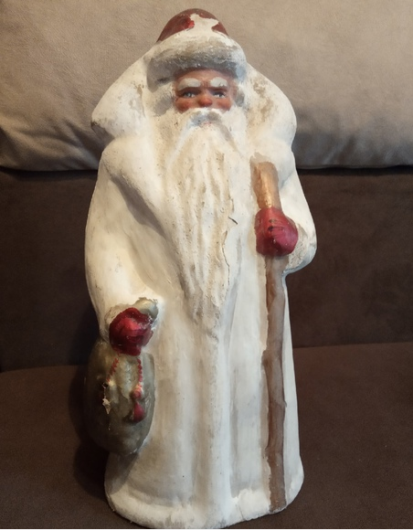Сегодняшний отчёт мастеров-кукольников мы решили начать с ещё одного преображения Дедушка Мороз, папье маше, артель "Детская игрушка", город Ростов на Дону 1961 года. Убраны трещины и сколы, а так же неудачный слой шпаклёвки, с которым мы столкнулись. Этот Морозик является семейной реликвией и мы надеемся, что наши заказчики и дальше будут передавать его по
