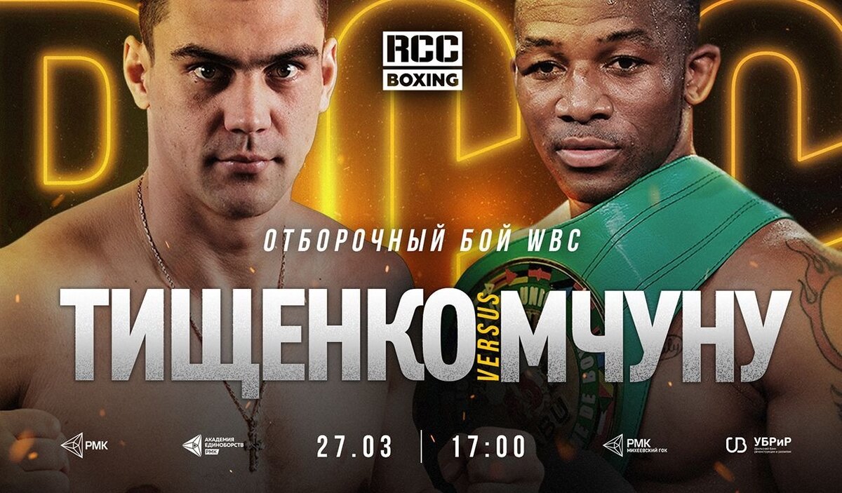 Олимпийский чемпион-2016, чемпион мира-2015 и двукратный чемпион Европы Евгений Тищенко(8-0, КО 6) в своем девятом поединке на профессиональном ринге встретится с обладателем пояса WBC Silver в первом тяжелом весе Табисо Мчуну (22-5, КО 13) из ЮАР. Этот бой возглавит турнир RCC Boxing Promotions, который пройдет 27 марта в Екатеринбурге.