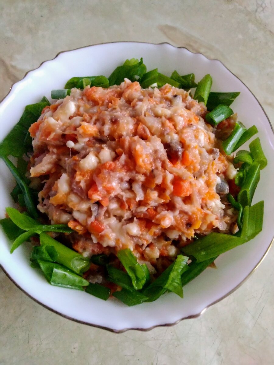 Булку замочить, затем отжать и пропустить все через мясорубку, сверху можно украсить орехами.