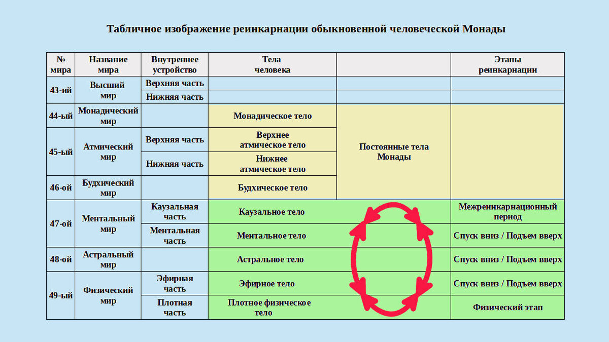 Что же это за процесс по установлению связи Монады со своим собственным физическим телом? Ответ на этот вопрос может не совсем понравиться читателям, но это наука и не должна умалчивать факты. Как уже говорилось в предыдущей статье, у человеческой Монады есть два «отдельных» сознания. Одно из них, а именно сознание №1, является главным (основным), постоянным (непрерывным) и функционирует в постоянных телах Монады (монадическом, верхнем и нижнем атмических, будхическом и каузальном). Вторым является сознание №2, оно носит временный характер и просыпается от анабиоза когда построен новый комплект временных тел Монады (ментальное, астральное, эфирное и плотное физическое) и обитает в них. «Верхнее» или сознание №1 «отделено» от «нижнего» или сознания №2, «перегородкой» называемой в Теософии « Антахкарана». Когда реинкарнация заканчивается, сознание №2 Монады снова впадает в анабиоз. Как уже было сказано выше, когда комплект новых, временных тел реинкарнирующейся Монады готово к использованию, сознание Монады №2 начинает в них обитать и использовать по своему усмотрению. Сознание №2 можно сравнить с жильцом, которое въезжает в только что сданную новую квартиру.