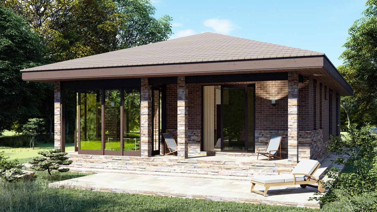 БОРГО 124 м2 - проект современного одноэтажного дома 11х18 с тремя спальнями, из поризованного камня и кирпича.