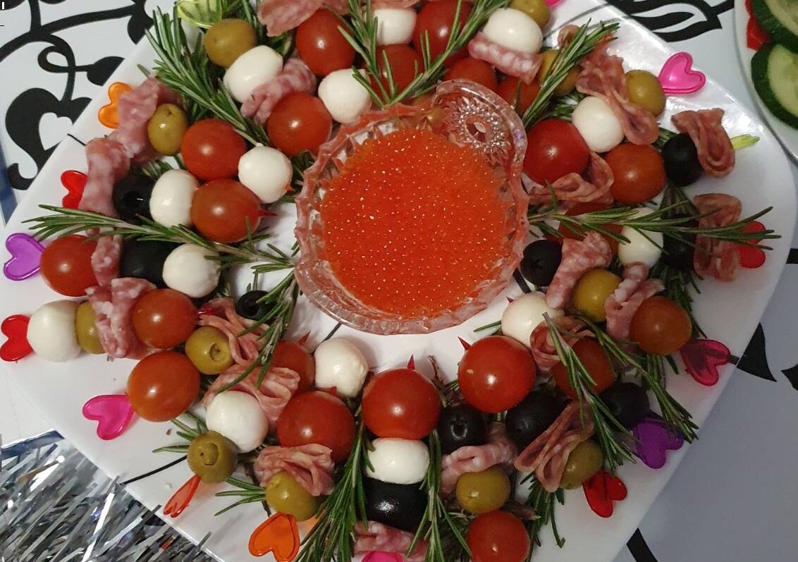 Красный помидорчик, белоснежный шарик сыра, черная оливка и аппетитная колбаска.