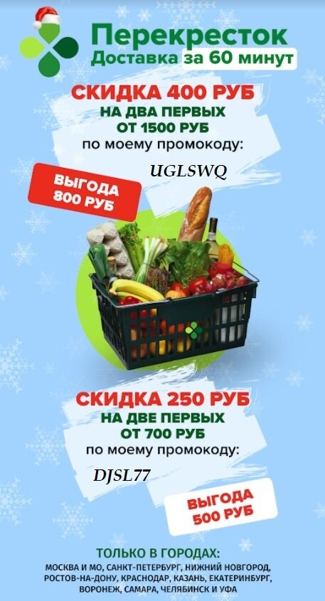 Промокод UGLSWQ даёт скидку в размере 400 рублей на покупки от 1500 рублей на первые два заказа для новых пользователей. Промокод DJSL77 даёт скидку 250 рублей от 700 рублей на первые два заказа для новых пользователей.