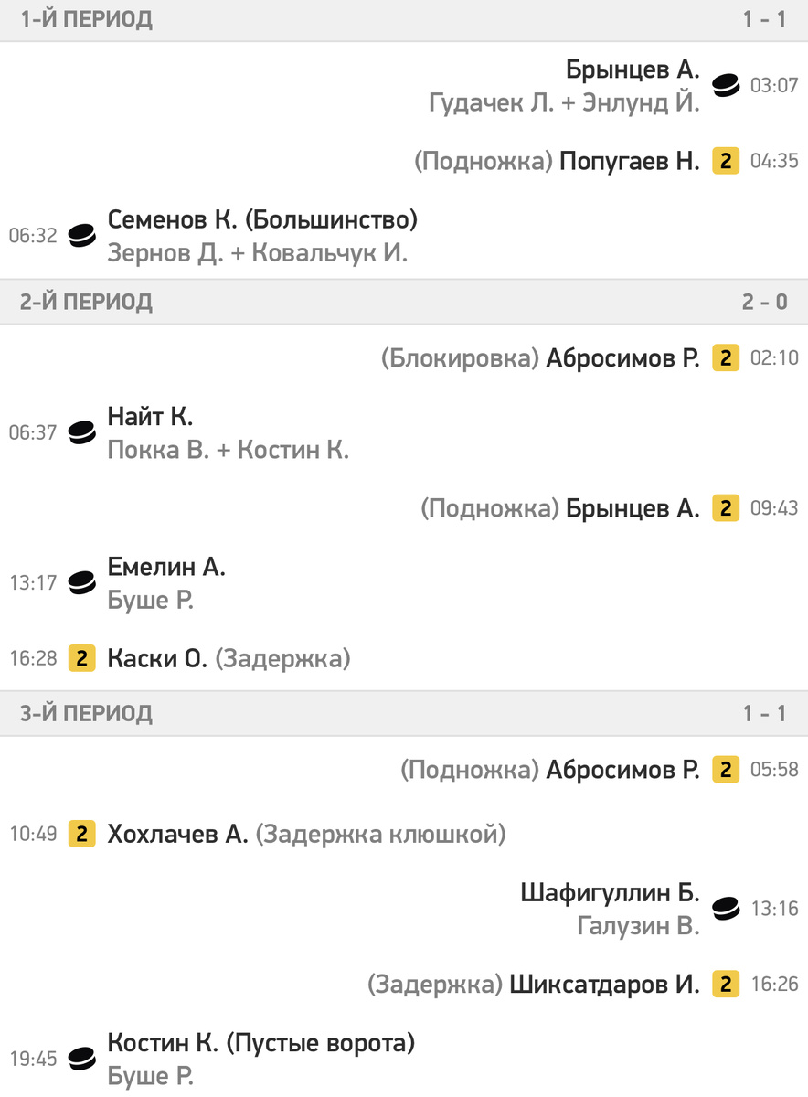 Встреча, состоявшаяся в воскресенье в Балашихе, завершилась со счетом 4:2 (1:1, 2:0, 1:1) в пользу "Авангарда". Заброшенными шайбами в составе победителей отметились Кирилл Семёнов (на 7-й