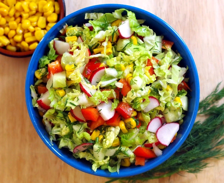 В миске смешать капусту, перец, огурец, редис и кукурузу. Добавить рубленую зелень укропа.