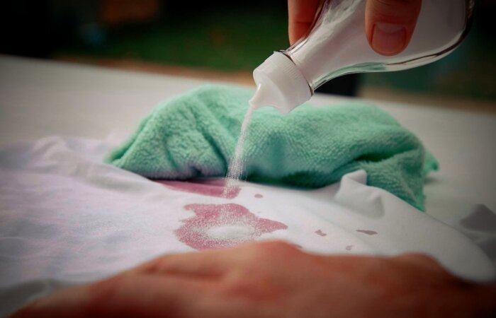 Поваренная соль - идеальное средство для удаления красных пятен, например, от вина, борща, крови или фруктовых соков. Достаточно присыпать пятно толстым слоем соли, которую можно сменить на свежую после того, как предыдущая впитала пролитое вещество. Лучше всего оставить соль на пятне на 15-20 минут, затем собрать и замочить ткань в воде или постирать ее влажной тканью (например, в случае ковра или тканевой обивки). От пятна не останется и следа.