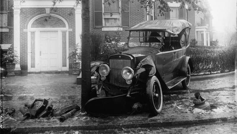 Оно произошло в Лондоне, неопытный водитель Артур Эдселл (водительский стаж Артура составлял три недели) летел по дороге с немыслимой скоростью в 13 км/ч, сильно отвлекаясь на сидящую рядом юную леди и не заметил замершую в изумлении на дороге Бриджит Дрискол, потерявшую дар речи от вида экипажа без лошадей и попытавшуюся защититься от него зонтиком. Это был первый