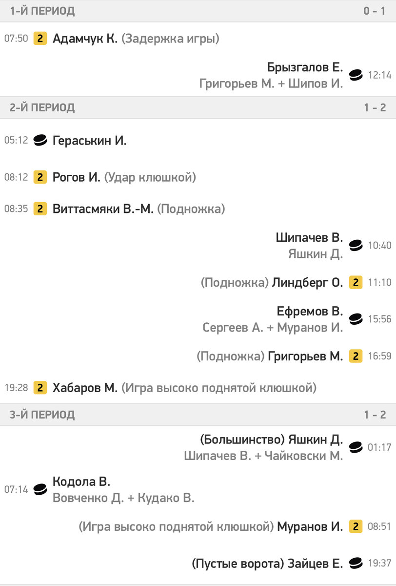 В составе победителей голы забили Егор Брызгалов (13), Вадим Шипачев (31), Владислав Ефремов (36), Дмитрий Яшкин (42) и Егор Зайцев (60). У соперников по шайбе записали на свой счет Игорь Гераськин (26) и Владислав Кодола (48).
