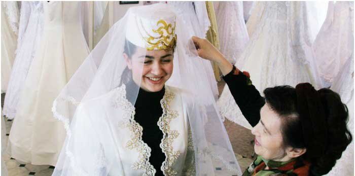 Невеста стояла в углу комнаты в нарядном белом платье, с высоким головным убором. Лицо полностью закрыто легким полупрозрачным покрывалом. Я с мамой стояли рядом с невестой. Каждый вновь пришедший приподнимал покрывало, говорил поздравление, совал купюру ей в руки и отходил в сторону.