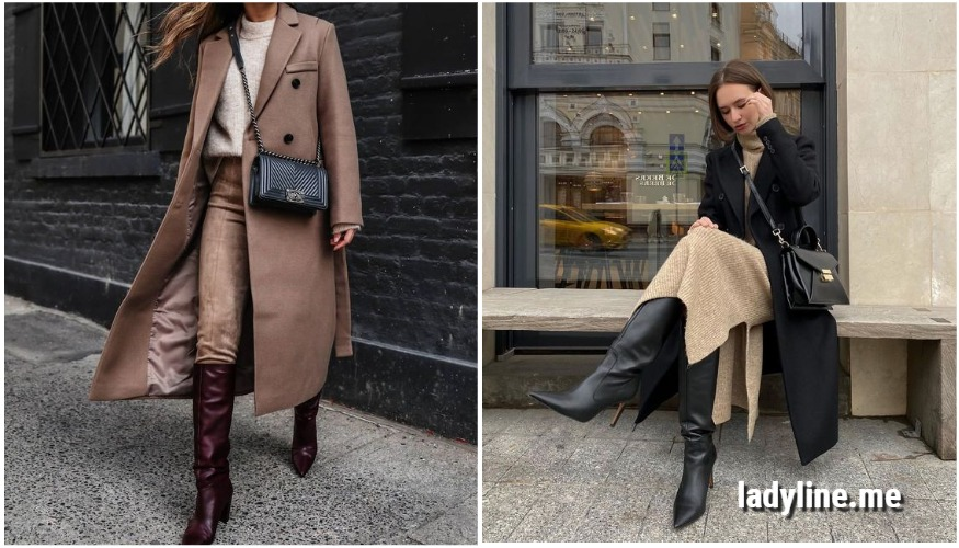 Стилисты также предлагают нам комбинировать высокие остроносые сапоги с трикотажным миди платьем, классическим пальто и сумкой с длинным ремешком.