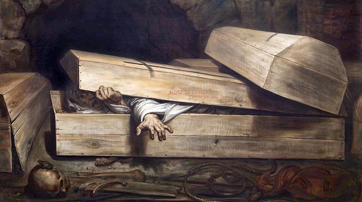 Нельзя сказать, чтобы эти страхи были совсем беспочвенны. Скажем, во время эпидемий тела умерших старались закапывать как можно скорее, не особо заморачиваясь констатацией смерти и ее причинами. Современные исследования массовых захоронений подтверждают как минимум несколько таких случаев. Также погребение заживо практиковалось во многих странах как казнь за ряд тяжких преступлений. Тем не менее, тафофобия долгое время оставалась делом редким и сугубо индивидуальным. Но вот в 1844 году на волне всеобщего увлечения мистицизмом, делами загробными и прочей некрофилией Эдгар По публикует свой рассказ «Преждевременное погребение» и заверте...