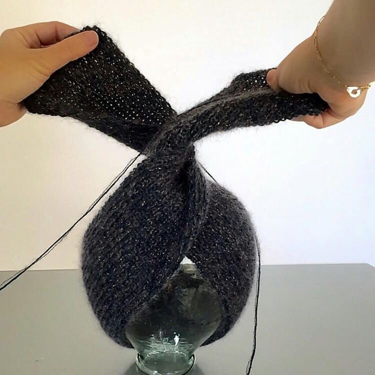 Затем я сворачивала связанное полотно так, как указано на фото в карусели и фиксировала швами. Места, где была бросовая нить, сшивала по петлям, убирая бромовую нить. ‼️Не забудьте немного зафиксировать чалму в лобной части швом, в этом случае она будет плотно прилегать к голове.