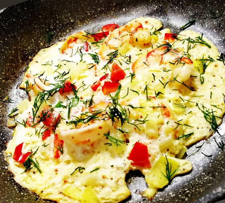 100 г очищенных креветок, 1 яйцо, немного лука, перчика болгарского, по желанию - специй.