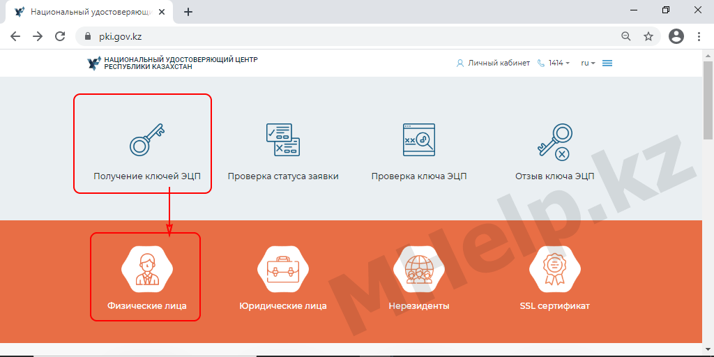 - Откройте главную страницу НУЦ, нажмите пункт Получение ключей ЭЦП ;